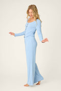 A dreamy blue hue and soft texture define this timeless two-piece pajama set. Crafted from mid-brushed pointelle that’s smooth and lightly textured, it includes a scoop-neck long-sleeve top and relaxed pants accented with delicate scalloped trim and dainty button details—made for cozy evenings and unhurried mornings.